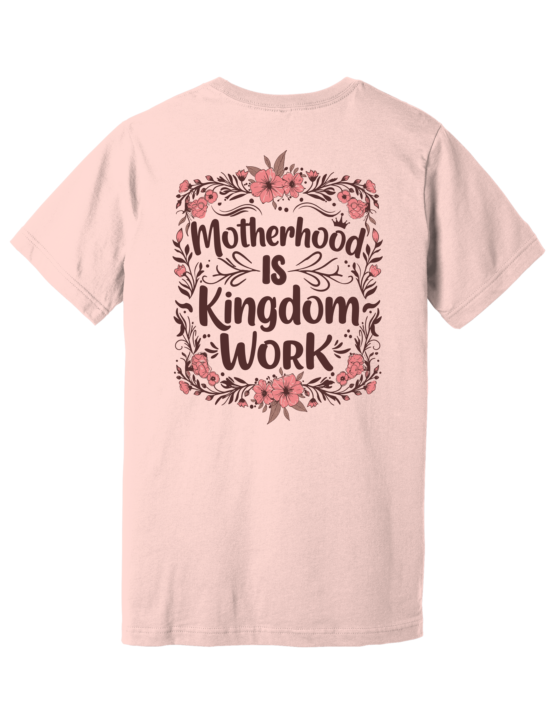 Celebrate the incredible journey of motherhood with this beautiful and meaningful t-shirt! Featuring a delicate "Mom" design on the front chest and a stunning floral-framed "Motherhood is Kingdom Work" graphic on the back, this shirt is perfect for proud moms who embrace their calling.