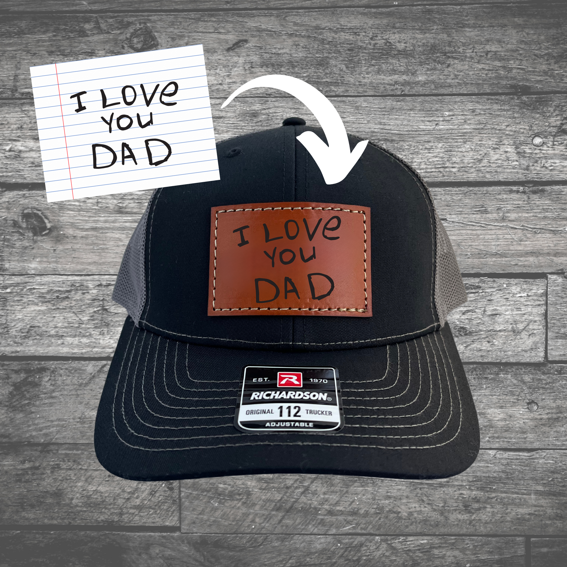 Richardson 112 trucker hat features a genuine leather patch custom engraved with a heartfelt message for Dad, Papa, Mama, etc. designed by their little buddy!